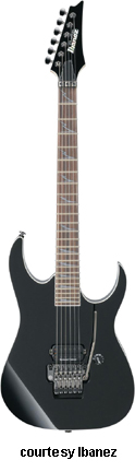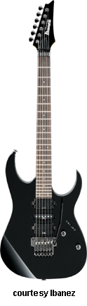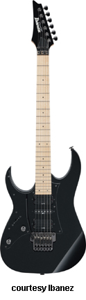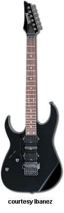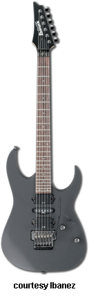 RG2610E | - offset double cutaway basswood body, white body binding, bolt-on five-piece maple/walnut Wizard Prestige neck, 24-fret bound rosewood fingerboard with wedge sharktooth inlays, bound headstock, six-on-one-side tuners, Edge Pro tremolo bridge with locking nut, single Seymour Duncan TB-10 pickup, single volume knob, black chrome hardware, available in Black finish, hard shell case included, mfg. 2007 only. |
