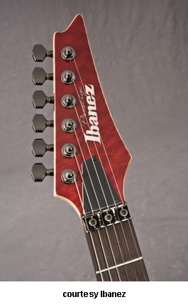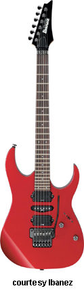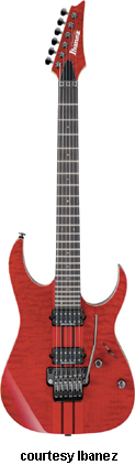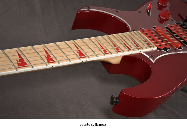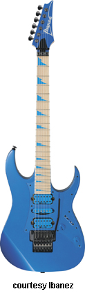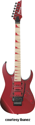 RG770DX REISSUE | - offset double cutaway basswood body, bolt-on five-piece 1987 Original Wizard Prestige maple neck, 24-fret bound maple fingerboard with blue or red sharktooth inlays, matching finish headstock overlay, six-on-one-side tuners, Edge double locking tremolo bridge, clear pickguard, two DiMarzio humbucker pickups (bridge: F2, neck: F4) and one DiMarzio single coil pickup (mid: C3), two knobs (v, tone), five-way pickup switch, matching finish plastic parts, black chrome hardware, available in Lazer Blue or Ruby Red finish, mfg. summer 2008 only. |