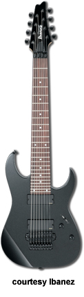 RG2228 | - eight-string configuration, offset double cutaway RG-style basswood body, bolt-on five-piece maple/wenge Wizard neck, 24-fret rosewood fingerboard with pearl dot inlays, black headstock with four-per-side tuners, Fixed Edge III-8 bridge with locking nut, two EMG pickups, two knobs (v, tone), three-way switch, black chrome hardware, available in Galaxy Black finish, 27 in. scale, mfg. 2007-present. |