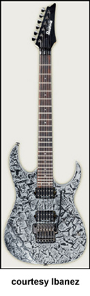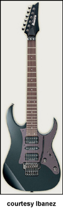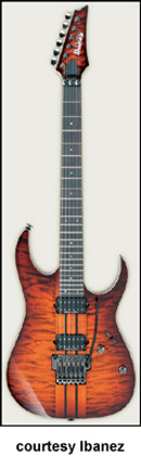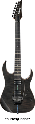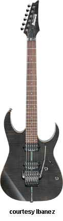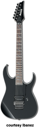 RG3520Z | - offset double cutaway RG-style mahogany body, flamed maple top, bolt-on five-piece maple/walnut Wizard neck, 24-fret rosewood fingerboard with pearl dot inlays, flamed maple matching finish headstock overlay, six-on-one-side tuners, Edge Zero double locking tremolo bridge with ZPS3 spring system, two DiMarzio IBZ pickups, two knobs (v, tone), three-way pickup switch, black chrome hardware, available in Himalayan Black finish, mfg. 2008 only. |