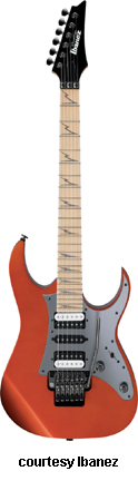 RG1550M | - offset double cutaway RG-style basswood body, five-piece Wizard Prestige maple/walnut neck, 24-fret maple fingerboard with black dot inlays, standard headstock with black overlay and logo, six-on-one-side tuners, Edge Pro tremolo bridge, black pickguard, two humbucker (V7 neck, V8 bridge) and one single coil (S1 mid) pickups, two knobs (v, tone), five-way switch, available in Phantom Blue or Poisoned Pumpkin finish, 25.5 in. scale, hardshell case included, new 2009. |