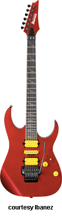 RG3570Z | - offset double cutaway RG-style basswood body, bolt-on five-piece maple/walnut Super Wizard Prestige neck, 24-fret bound rosewood fingerboard with wedge sharktooth inlays, standard headstock with matching finish overlay and logo, six-on-one-side tuners, Edge Zero double locking tremolo bridge with ZPS3 spring system, no pickguard, one DiMarzio Air Norton humbucker (neck), one DiMarzio True Velvet single coil (mid), and one DiMarzio Tone Zone humbucker pickups all with yellow covers, two yellow knobs (v, tone), five-way pickup switch with a yellow tip, black chrome hardware, available in Laser Blue or Candy Apple finish, 25.5 in. scale, hardshell case included, new 2009. |