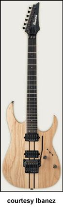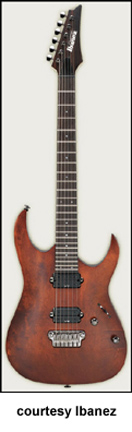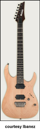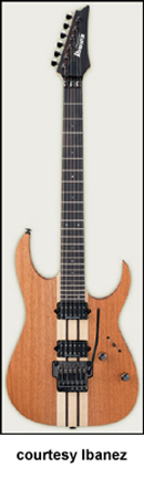 IBANEZ | ELECTRIC: RG PRESTIGE SERIES | In 2009, all production of Ibanez Prestige guitars moved back to Japan exclusively. | RGA121 | - offset double cutaway mahogany body, maple arched top, five-piece Wizard Prestige maple/walnut neck, 24-fret rosewood fingerboard with dot inlays, black headstock with six-on-one-side tuners, Gibraltar Plus bridge, pickguard, two humbucker pickups, two knobs, five-way switch, available in Natural Flat or Violin Flat finish, mfg. 2005-08. |