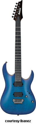 RGA321 | - offset double cutaway RG-style mahogany body with AAA flame maple arched top, five-piece Wizard Prestige maple/walnut neck, 24-fret rosewood fingerboard with abalone small dot inlays, standard headstock with black overlay and logo, six-on-one-side tuners, Gibraltar Plus bridge, two Ibanez LoZ4 EMG-style active pickups, two knobs (v, active tone), three-way pickup switch, black chrome hardware, available in Sapphire Blue finish, 25.5 in. scale, hardshell case included, new 2009. |