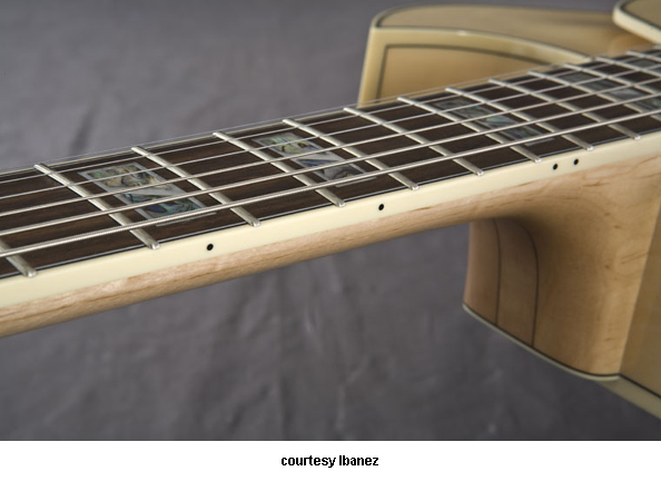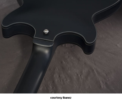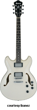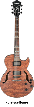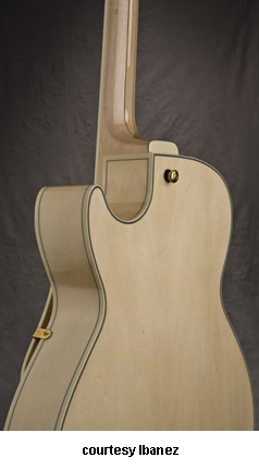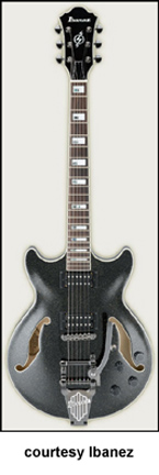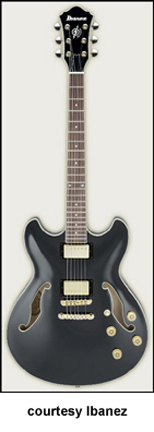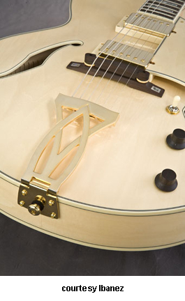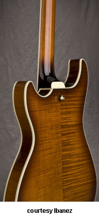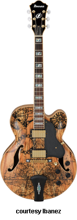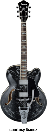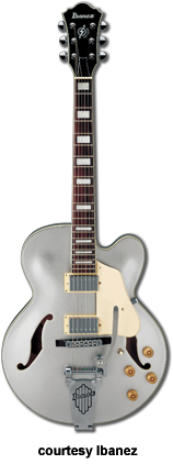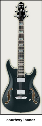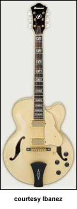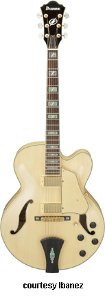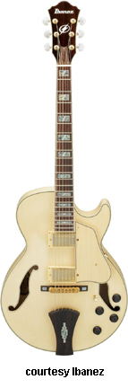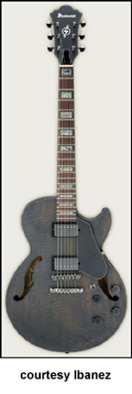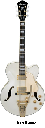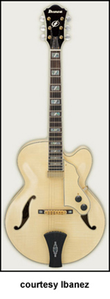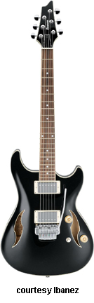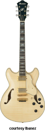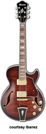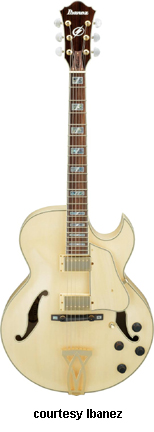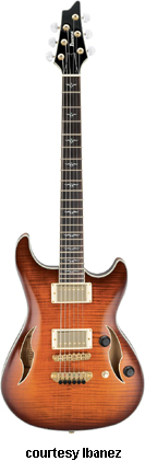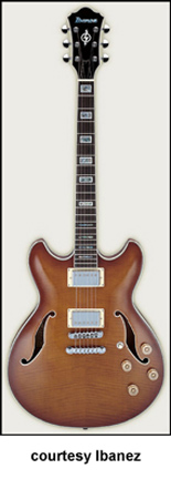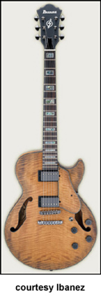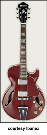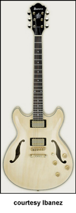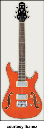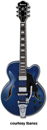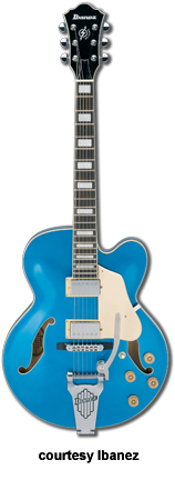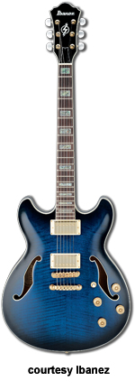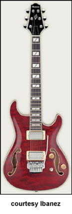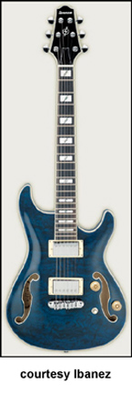 AWD82 | - offset double cutaway thin hollow body archtop RG style, bubinga top, maple top and sides, two f-holes, body binding, three-piece maple/mahogany neck, 22-fret rosewood fingerboard with AWL block inlay, three-per-side tuners, fixed bridge, two humbucker pickups, two knobs, three-way switch, chrome hardware, available in Trans. Blue finish, mfg. 2005 only. |
