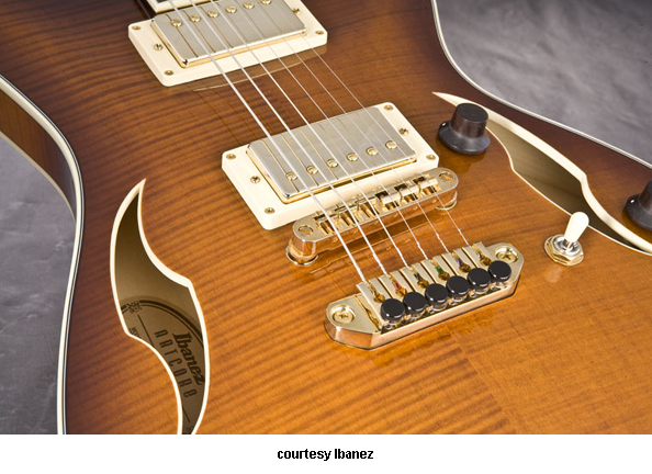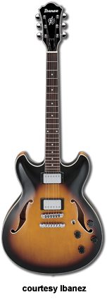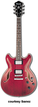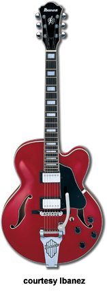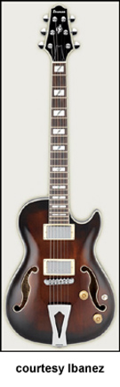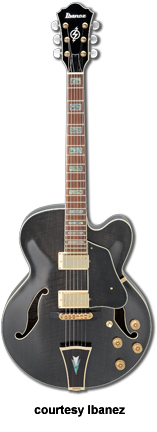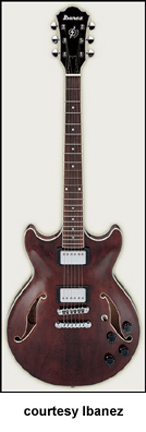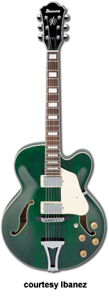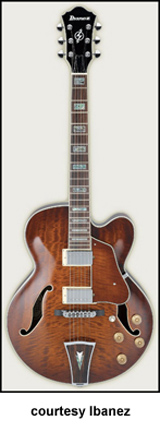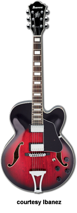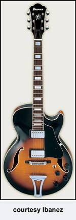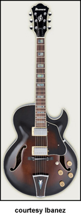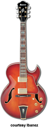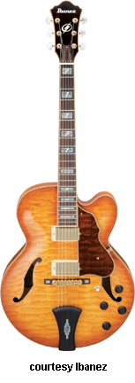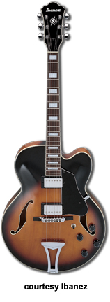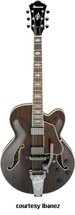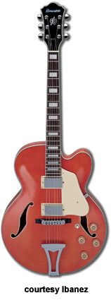 IBANEZ | ELECTRIC: ARTCORE SERIES | The Artcore Series replaced the Artstar Series. All models in this series are hollowbody archtops that are mainly based on some of Gibson's popular designs such as the ES-5, ES-175, and ES-335. | AF75 | - single cutaway jumbo hollow body archtop ES-5 style, maple back/top/sides, two f-holes, body binding, mahogany neck, 22-fret rosewood fingerboard with block inlay, three-per-side tuners, fixed bridge, trapeze tailpiece, pickguard, two humbucker pickups, four knobs, three-way switch, chrome hardware, available in Brown Sunburst, Trans. Blue Sunburst (disc.), Trans. Orange (2002-06), or Trans. Red Sunburst (2007-present) finish, mfg. 2002-present. |