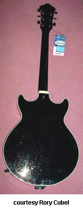 AXD71 | - single cutaway ES-125 style body, maple top/back/sides, single f-hole, body binding, mahogany neck, 22-fret rosewood fingerboard with dot inlay, three-per-side tuners, fixed bridge, two humbucker pickups, two knobs, three-way switch, chrome hardware, Black finish, mfg. 2004 only. |