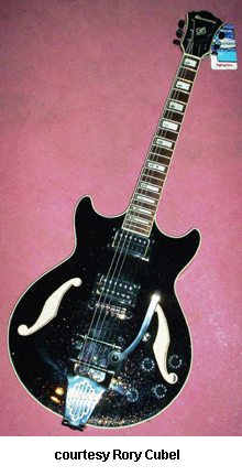 AM77 | - double cutaway thin hollow body archtop ES-335 style, maple back/top/sides, two f-holes, body binding, three-piece maple/mahogany neck, 22-fret rosewood fingerboard with block inlay, three-per-side tuners, Vintage Vibrato tailpiece, pickguard, two exposed humbucker pickups, four knobs, three-way switch, black hardware, available in Nebula Black finish, mfg. 2004 only. |