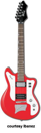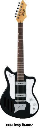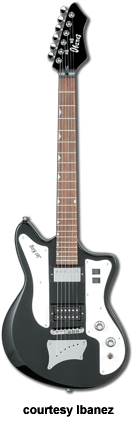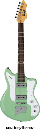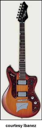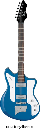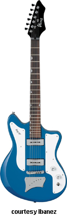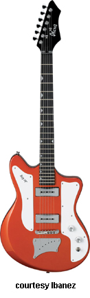 JTK3 | - offset double cutaway Talman style mahogany body, three-piece maple neck, 22-fret rosewood neck with offset triangle inlays, black headstock overlay with retro logo, six-on-one-side tuners, BR-EG bridge, STB with plate, two pickguards leaving the center strip of the guitar exposed, two Ibanez HFS single coil pickups, two knobs, three-way pickup switch, chrome hardware, available in Bluestone or Roadster Orange Metallic finish, mfg. 2008 only. |