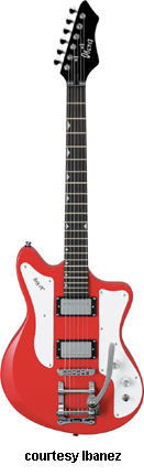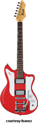 JTK40 | - offset double cutaway Talman style mahogany body, three-piece maple neck, 22-fret rosewood neck with offset triangle inlays, natural headstock with retro logo, six-on-one-side tuners, ART2 bridge, VBX60 Vintage Vibrato tailpiece, two pickguards leaving the center strip of the guitar exposed, two Ibanez ACH4 humbucker pickups, two knobs (v, tone), three-way pickup switch, chrome hardware, available in Red finish, new 2009. |