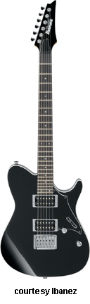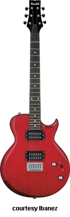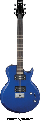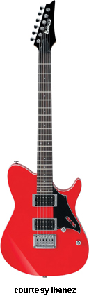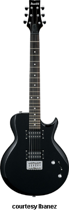 IBANEZ | ELECTRIC: MISC. MODELS | | GART30 | - single cutaway basswood body, bolt-on maple neck, 22-fret rosewood fingerboard with pearl dot inlays, black headstock overlay, three-per-side tuners, fixed bridge with adj. saddles, two exposed humbucker pickups, two knobs (v, tone), three-way pickup switch, chrome hardware, available in Black Night, Jewel Blue, or Trans. Red finish, 24.7 in. scale, new 2009. |