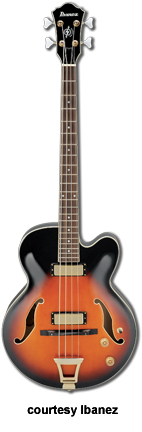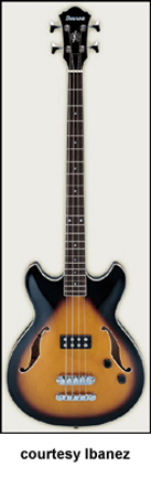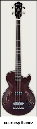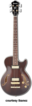 AGB140 | - single smooth cutaway Les Paul Bass style hollow body, maple top/back/sides, 2 f-holes, body binding, three-piece maple/mahogany neck, 22-fret rosewood fingerboard with dot inlay, two-per-side tuners, Gibraltar III bridge, single pickup, two knobs, chrome hardware, available in Trans. Brown finish, 34 in. scale, mfg. 2004-06. |