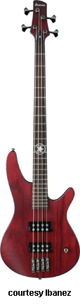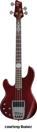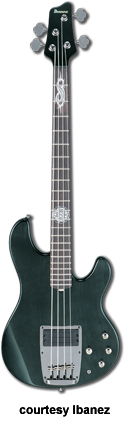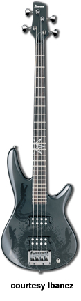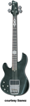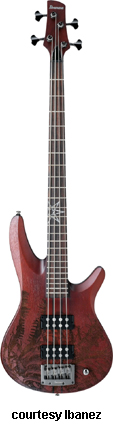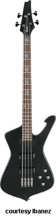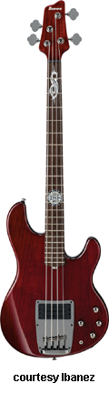 SDB1 SHARLEE D'ANGELO SIGNATURE | - offset double cutaway Iceman-style mahogany body, five-piece maple/bubinga NTB, 22-fret rosewood fingerboard with custom inlays, black headstock overlay, two-per-side tuners, Mono-Rail IV bridge, two Ibanez PFR pickups, active electronics, four knobs (v, t, b, blend), black chrome hardware, available in Black Flat finish, mfg. 2008-present. |