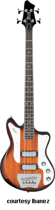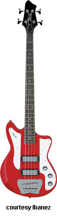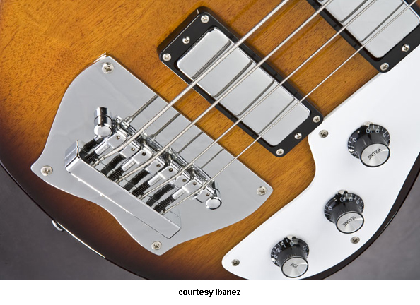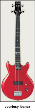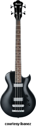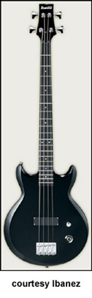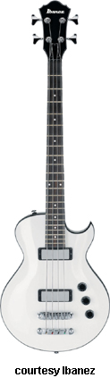 IBANEZ | ELECTRIC BASS: MISC. MODELS | | ARTB100 | - single sharp cutaway mahogany body, single-ply binding, set three-piece maple/mahogany neck, 22-fret bound rosewood fingerboard with pearl dot inlays, bound headstock with black overlay and logo, two-per-side tuners, Gibraltar III bass bridge, two ACHB mini humbucker pickups, three barrel knobs, chrome hardware, available in Black or White finish, 30 in. scale, new 2009. |