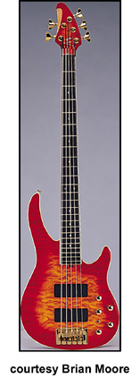 iGUITAR, INC. (FORMERLY BRIAN MOORE GUITARS) | ELECTRIC BASS: i2000 SERIES | | i4 | - double offset sharp cutaway, contoured ash body, highly figured maple top with matching headstock, three-piece maple/padouk/maple neck thru body, 24-fret rosewood fingerboard, two black soapbar pickups, five knobs, slap switch, active electronics, standard bridge, gold hardware, available in Tobacco Sunburst, Cherry Sunburst or Natural finish, 34 in.scale, current mfg. |