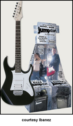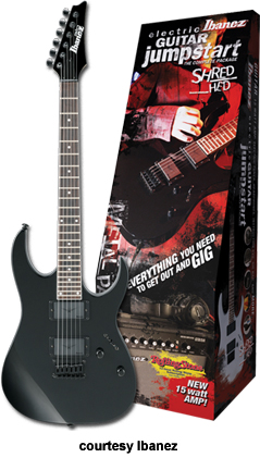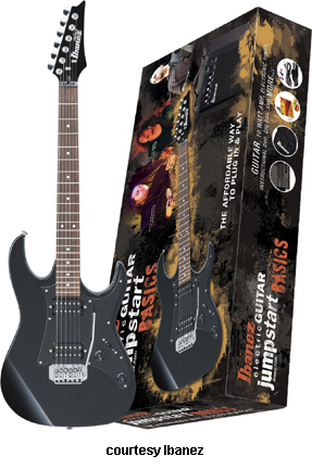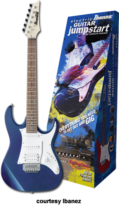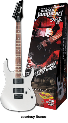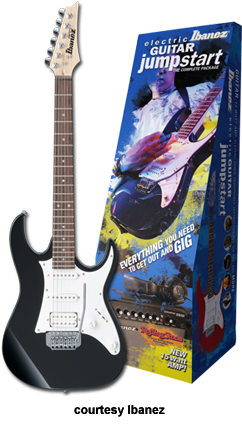 IJX121 JUMP START PACKAGE | - includes GRG guitar available in Black Night, Silver (2007 only), or White (2008-present) finish, Ibanez 15W guitar amp, strap, electronic tuner, padded gig bag, wooden guitar stand, picks, cable, and an instructional DVD, mfg. 2007-present. |