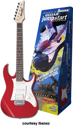 IJX40 JUMP START PACKAGE | - includes GRG guitar available in Black Night, Jewel Blue, Metallic Red, or White finish, Ibanez GTP10 10W guitar amp, strap, electronic tuner, padded gig bag, wooden guitar stand, picks, cable, and an instructional DVD, current mfg. |