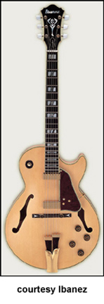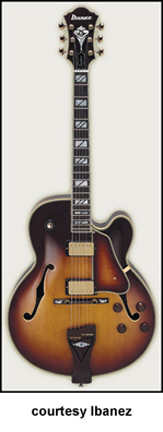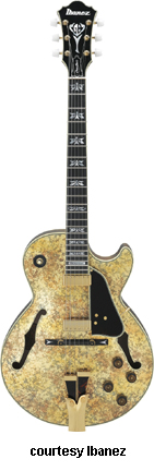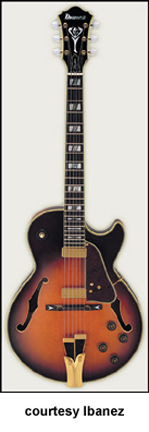 GB10 | - single round cutaway hollow style, arched spruce top, bound f-holes, raised bound black pickguard, bound body, flamed maple back/sides, three-piece maple/mahogany neck, 22-fret bound ebony fingerboard with pearl/abalone split block inlay/George Benson signature block inlay at 21st fret, ebony bridge with pearl arrow inlays, ebony/metal tailpiece, bound peghead with abalone torch/logo inlay, three-per-side tuners with pearloid buttons, gold hardware, two Ibanez humbucker pickups, four knobs (two v, two tone), three-way switch, available in Antique Violin (disc.), Brown Sunburst, or Natural finish, mfg. 1977-present. |