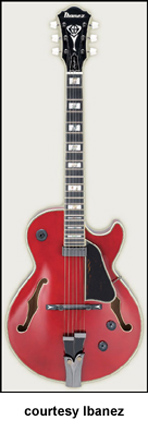 GB15 | - single round cutaway hollow style body, arched spruce top, two bound f-holes, B/N/H binding, maple back/sides, three-piece GB prestige set-neck, 22-fret ebony fingerboard with pearl/abalone split block inlay, abalone torch/logo inlay on headstock with three-per-side tuners, adjustable ebony bridge with pearl arrow inlays, ebony/metal two-part tailpiece, raised bound wood pickguard, one Ibanez humbucker pickup, two knobs (v, tone), coil-tap switch, chrome hardware, available in Trans. Red finish, 24.75 in. scale, mfg. 2006-present. |