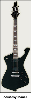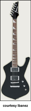 IC300 SECOND VERSION | - Iceman-style bound basswood body with pointed bottom bout, bolt-on maple neck, 22-fret bound rosewood fingerboard with pearl dot inlay, three-per-side tuners, tune-o-matic bridge/stop tailpiece, two Ibanez humbucker pickups, two knobs (v, tone), three-way switch, chrome hardware, available in Black or Jewel Blue finish, mfg. 1994-2003. |
