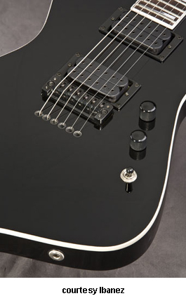 IC400 THIRD VERSION | - Iceman-style mahogany body, IC set maple neck, 22-fret bound rosewood fingerboard with Iceman parallelogram inlay, tune-o-matic bridge/stop tailpiece, three-per-side tuners, chrome hardware, two Ibanez humbucker pickups, four knobs (two v, two tone), three-way switch, available in Black finish, mfg. 2004-07. |