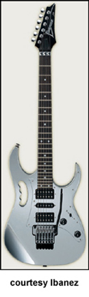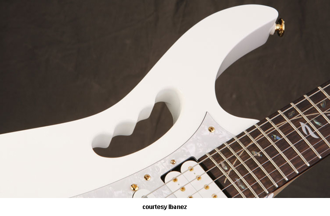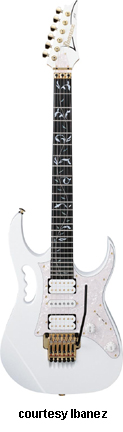 IBANEZ | ELECTRIC: STEVE VAI SIGNATURE (JEM/UV) SERIES | The JEM Series was co-designed by Steve Vai, introduced in 1987, and feature the Monkey-Grip handle cut out of the body. The Universe Series (UV) was introduced in 1990 and are all seven-string models. | JEM555 | - offset double cutaway American basswood body, bolt-on maple neck, 24-fret rosewood fingerboard with pearl dot/vine inlay with Steve Vai signature block inlay at 24th fret, Lo TRS II tremolo, six-on-a-side tuners, charcoal hardware, humbucker/single coil/humbucker DiMarzio pickups, volume/tone control, five-way switch, available in Black or White finish, mfg. 1994-2000. |