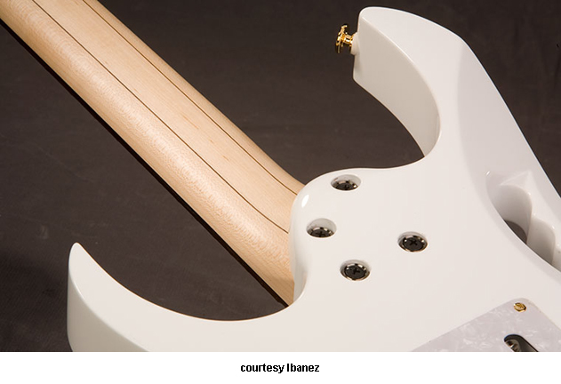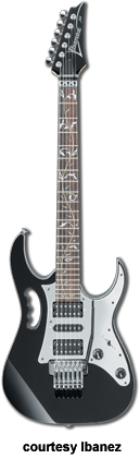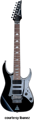 JEM77V | - offset double cutaway RG-style basswood body with bass bout hand-grip cutout, bolt-on five-piece maple/walnut JEM Prestige neck, 24-fret rosewood fingerboard with pearl/abalone vine inlays, black headstock with six-on-one-side tuners, Edge Pro tremolo with locking nut, chrome pickguard, two DiMarzio Breed humbucker and one DiMarzio Breed single coil pickups HSH, two knobs (v, tone), five-way pickup switch, chrome hardware, available in Black finish, hardshell case included, mfg. 2007-present. |