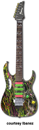 JEM 20TH ANNIVERSARY | - reissue of Steve Vai's original RG model, offset double cutaway acrylic resin body with three-dimensional multi-color inside, bolt-on five-piece JEM Prestige neck, 24-fret rosewood fingerboard with pearl and abalone vine inlays, standard headstock with six-on-one-side tuners, Edge Pro tremolo bridge with locking nut, clear pickguard, two DiMarzio humbucker pickups and one DiMarzio single coil pickup HSH (pickups have green and pink covers), two colored (green/yellow) knobs (v, tone), five-way pink pickup switch, chrome hardware, limited mfg. 2007 only. |
