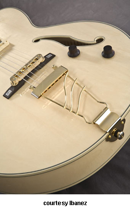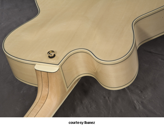 PM35 PAT METHENY | - single rounded cutaway semi-hollow body, maple top, back, and sides, two bound f-holes, multi-layer B/W binding, set five-piece maple/bubinga neck, 22-fret bound rosewood fingerboard with pearl/abalone block inlays and 21st fret Pat Metheny signature block inlay, rosewood headstock overlay with Ibanez logo and lightning bolt inlay, three-per-side tuners with pearl buttons, rosewood mounted ART 1 bridge, gold trapeze tailpiece, single Ibanez Super 58 covered humbucker pickup, two knobs (v, tone), gold hardware, available in Natural finish, case included, mfg. 2008-present. |