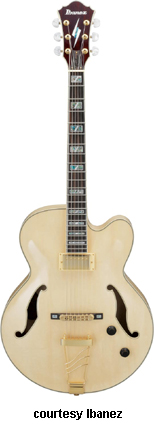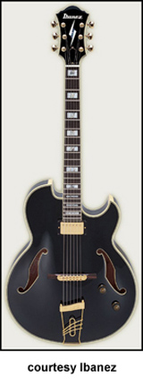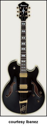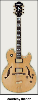 PM100 PAT METHENY | - slightly offset double cutaway semi-hollow body, abalone bound maple top/back/sides, two bound f-holes, set-in mahogany neck, 22-fret bound ebony fingerboard with pearl/abalone block inlay/Pat Metheny signature block at 21st fret, raised ebony bridge, metal trapeze tailpiece, gold hardware, three-per-side tuners, black peghead with Ibanez logo/slash diamond inlay, single Ibanez Super 58 covered humbucker pickup, two knobs (v, tone), available in Black, Brazilian Red (disc.), Electric Blue (disc.) or Natural (disc.) finish, mfg. 1996-present. |