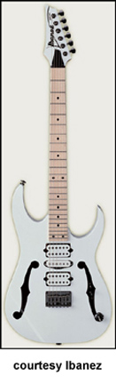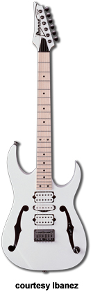 IBANEZ | ELECTRIC: PAUL GILBERT SIGNATURE (PGM) SERIES | PGM Series was designed in conjunction with Paul Gilbert (Racer X, Mr. Big). The PGM300 and PGM400 were announced in the early 1990s but never appeared in a catalog or price list. In 1998, a 90th Anniversary model was released. | PGM30 PAUL GILBERT | - RG-style offset double cutaway basswood body, two painted f-holes, bolt-on one-piece maple neck, 24-fret rosewood fingerboard with pearl dot inlay, Lo TRS II double locking tremolo, reverse peghead with screened logo, six-on-the-other-side tuners, chrome hardware, two humbucker and one single coil pickups HSH, volume control, five-way switch, available in White finish, mfg. 1995-2003. |