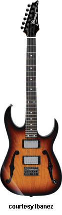 PGM401 PAUL GILBERT | - offset double cutaway ash body, painted f-holes, bolt-on five-piece maple/walnut Prestige neck, 24-fret rosewood fingerboard with pearl dot inlay, fixed bridge, black headstock overlay, six-on-one-side tuners, chrome hardware, two DiMarzio PAF-Classic humbucker pickups, single volume control, five-way switch, available in Trifade Burst finish, hardshell case included, new 2009. |