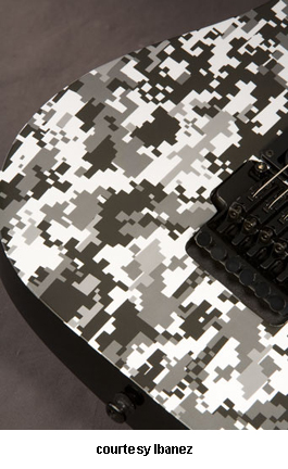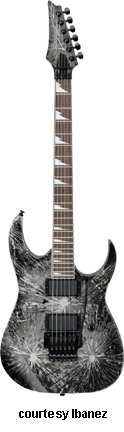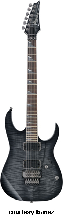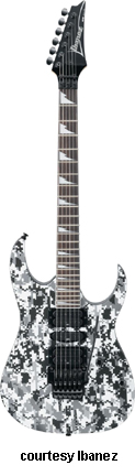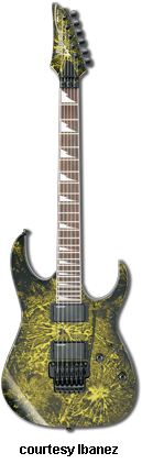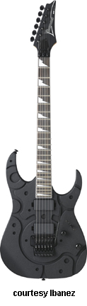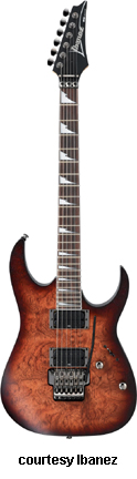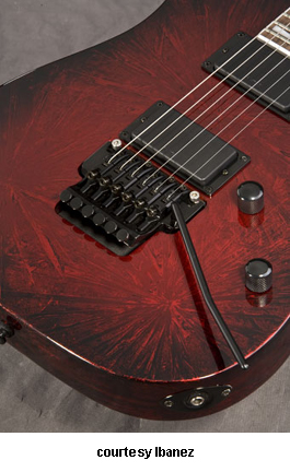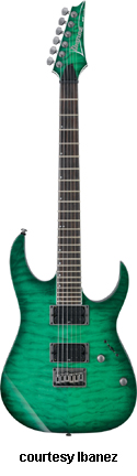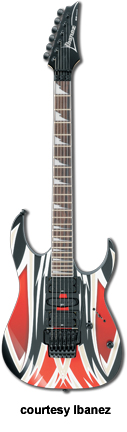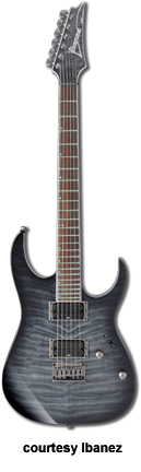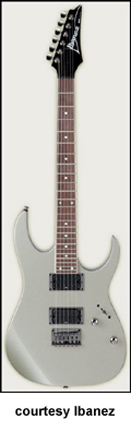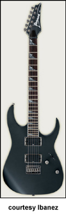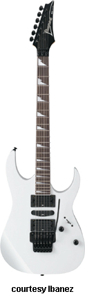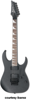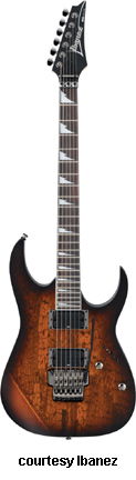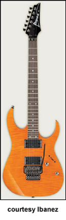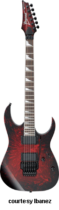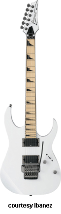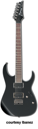 RGR320EX | - offset double cutaway basswood body, bolt-on three-piece maple Wizard II neck, 24-fret rosewood fingerboard with sharktooth inlays, matching finish reverse headstock, six-on-the-other-side tuners, Edge III tremolo bridge with locking nut, two Ibanez designed by EMG pickups, two knobs (v, tone), three-way switch, black hardware, available in Gold Artic Forest, Red Arctic Forest, Roadrage Black, or Silver Arctic Forest finish, mfg. 2007 only. |