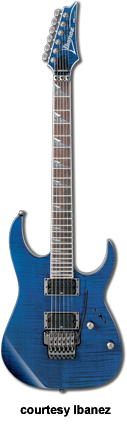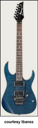 RG2120X | - offset double cutaway mahogany solid body, three-piece maple neck, 24 jumbo fret rosewood fingerboard, Wizard neck type, Double Locking Tremelo, L.R. Baggs piezo pickups, Double Edge bridge, six-on-one-side tuners, two humbucker pickups, available in Trans. Blue finish, mfg. 2002-04. |