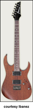RG420CM | - offset double cutaway mahogany body with cinnamon top, bolt-on three-piece maple Wizard II neck, 24-fret bound rosewood fingerboard with sharktooth inlays, black finish headstock, six-on-one-side tuners, Edge III tremolo bridge with locking nut, two Ibanez humbucking pickups (Infinity 1 in the neck position, Infinity 2 in the bridge position), two knobs (v, tone), three-way pickup switch, chrome hardware, available in Natural Brown Burst Flat finish, new 2009. |