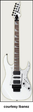 RG750 | - offset double cutaway basswood body, bolt-on maple neck, 24-fret bound rosewood fingerboard with sharktooth inlay, bound peghead, 6-on-a-side tuners, double locking vibrato, pickguard, two humbucker and one single coil Ibanez pickups HSH, two knobs (v, tone), five-way switch, black hardware, available in Black, Candy Apple, or White finish, mfg. 1992 only. |