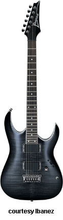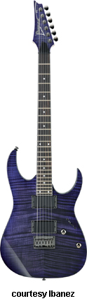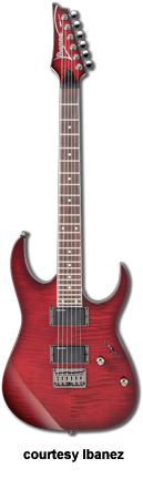 RGR421EXFM | - offset double cutaway mahogany body, flamed maple top, bolt-on three-piece maple Wizard II neck, 24-fret rosewood fingerboard with dot inlays, matching finish reverse headstock, six-on-the-other-side tuners, fixed bridge/tailpiece, two Ibanez designed by EMG pickups, two knobs (v, tone), five-way switch, chrome hardware, available in Blackberry Sunburst (2007-08) or Trans. Lavender Burst finish, mfg. 2007-present. |