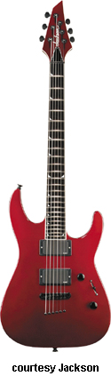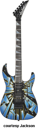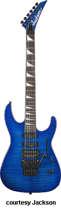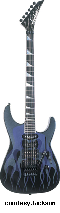 SOLOIST USA | - offset double cutaway poplar body, through-body maple neck, 24-fret bound ebony fingerboard with pearl sharkfin inlay, double locking vibrato, bound peghead with pearl Jackson logo inlay, 6-on-a-side tuners, black hardware, 2 stacked coil/1 humbucker Jackson pickups, volume/tone/mid boost controls, 5-position switch, active electronics, available in Bright Red, Deep Metallic Blue, Metallic Blue, or Pearl White finishes, mfg. 1991-95. |