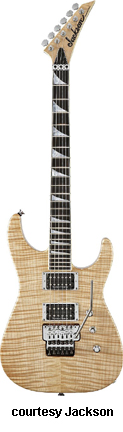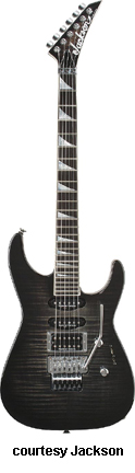 SL3 SOLOIST PRO SERIES (JAPAN MFG. NO. 290-4000) | - alder body, flame maple veneer on trans. finishes, rock maple neck-thru-body, 22-fret rosewood fingerboard with sharkfin inlays, pointy headstock with six-on-one-side tuners, Jackson Low Profile double locking tremolo, one Seymour Duncan JB humbucker and two Hot Rails single coil pickups HSS, two knobs (v, tone), three-way switch, chrome (disc. 2005) or black (2006-present) hardware, available in Black, Satin Black, Trans. Amber Sunburst, Trans. Natural, Trans. Blue, Trans. Red, or Trans. Violin Brown (disc. 2005) finish, mfg. 2002-present. |