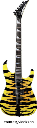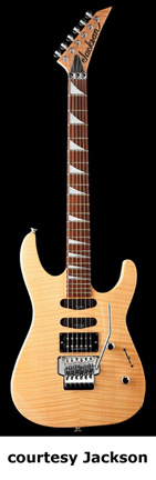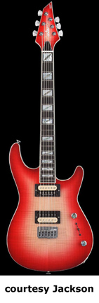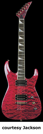 SOLOIST ARCHTOP | - offset double cutaway mahogany body, arched flame maple top, through-body maple neck, 24-fret bound ebony fingerboard with pearl sharkfin inlay, tune-o-matic bridge with through-body string holders, bound peghead with pearl Jackson logo inlay, 6-on-a-side Gotoh tuners, black hardware, 2 humbucker Jackson pickups, volume/tone control, 3-position switch, available in Cherry Sunburst, Trans. Amber, Trans. Blue, or Trans. Red finishes, mfg. 1989-1991. |