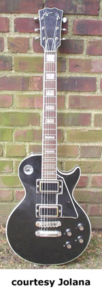 STRAT | - offset double-cutaway body copy of Fender Stratocaster and actually called "Jolana Strat" on the headstock, bolt-on neck, 21-fret fingerboard with pearl dot inlay, six-on-one-side tuners, fixed bridge, white or black pickguard, two humbucking pickups, volume/ tone controls, three-position slider switch, chrome hardware, available in Black, White, or Sunburst finish, mfg. late 1980s. |