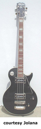 IRIS | - single cutaway body with decorative soundhole, bolt-on neck, 20 fret fingerboard with pearl dot inlay, aluminum nut, zero fret, four-on-one-side tuners, floating bridge, black pickguard, two single coil AlNiCo pickups, volume/ tone controls, four-position rotary selector switch, chrome hardware, bass equivalent of Iris guitar, Jolana's most popular bass model, available in sunburst finish, mfg. 1973-1980. |