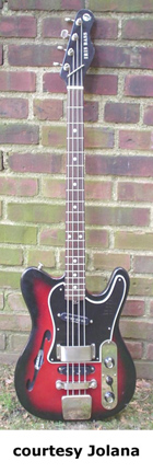 STUDIO | - thinline archtop, double cutaway, bolt-on neck, 20 fret bound rosewood or stained beech fingerboard with pearl dot inlay, bound top and soundholes, four-on-one-side tuners, aluminum nut, zero fret, two single coil pickups, volume/tone controls, bass equivalent of Studio guitar, chrome hardware, available in Red or Silverburst finish, mfg. 1970-73. |