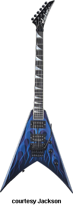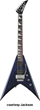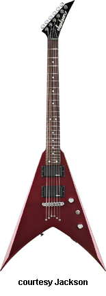 KV2 (KING V STD. MFG. 1993-97) | - V-style poplar body, bolt-on maple neck, 22-fret rosewood fingerboard with pearl dot inlay, double locking Floyd Rose vibrato, 6-on-a-side tuners, black hardware, 2 Jackson humbucker pickups, volume control, 3-position switch, available in Black, Bright Red, Candy Blue, or Snow White finishes, mfg. 1993-97. |