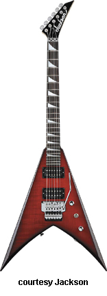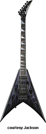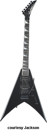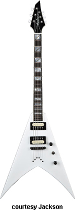 PHIL DEMMEL SIGNATURE KING V (JAPAN MFG. NO. 291-3060) | - Flying V-style alder body with two jagged edges on either side of the V cutout, quatersawn maple NTB, 24-fret black-bound ebony fingerboard with MOTO shark fin inlays, hockey stick-style headstock with black overlay and Jackson logo, six-per-side tuners, Floyd Rose double locking tremolo bridge, two EMG pickups (bridge: EMG 81, neck: EMG-60), two knobs (v, tone), three-way pickup switch, black hardware, availabe in Black with Silver bevels, Philly Red with Black bevels, or White with Black bevels finish, 25.5 in. scale, new 2008. |