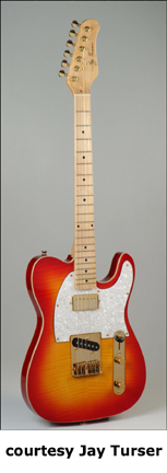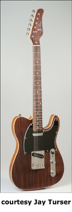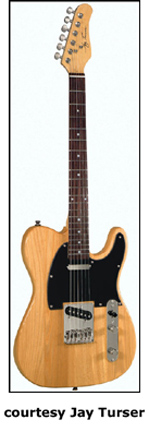 JAY TURSER | ELECTRIC: JT-LT SERIES (TELE-STYLE MODELS) | | JT-LT | - single cutaway Tele-style lightweight solid body design, rosewood fingerboard with dot position markers, six-on-one-side die-cast tuners, two pickups, three-way switch, white pickguard, available in Black or Ivory finish, mfg. 2001-present. |