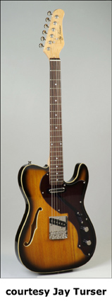 JT-LTCRUSDLX | - single cutawy semi-hollow Tele Thinline-style body, single bound f-hole, body binding, maple neck, rosewood fingerboard, Tele-style bridge, two single coil pickups, large pickguard, two knobs (v, tone), three-way switch, chrome hardware, available in Antique Natural Satin, Cherry Sunburst, or Natural finish, mfg. 2004-present. |