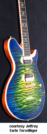 JET GUITARS | Guitars currently produced in Raleigh, NC since 1998. | Luthier Jeffrey Earle Terwilliger (JET) builds custom electric guitars in his Raleigh, NC shop. Each guitar is hand-built individually by Terwilliger using only high-quality woods and hardware. Exclusive innovative features include a peaked top joint, 24th endfret, and angled jack set into a bevel. Models include the Earlewood and Caldera, both available with the PLUS Piezo option. For more information, visit JET's website or contact him directly (see Trademark Index). | |