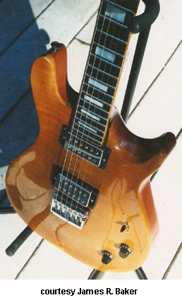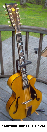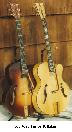 JAMES R. BAKER STRUNG INSTRUMENTS | Instruments currently built in Shoreham, NY. | Luthier James R. Baker builds conventional archtop guitars as well as innovative archtop designs that enhance the amplified capabilities of the guitar. While his Classic features traditionally placed f-holes, Baker's innovative Legend and Special models have teardrop-shaped soundholes in the lower bout, and a patented structure which eliminates feedback and increases sustain. All models now feature Kent Armstrong pickups. In 2007, Baker debuted a new division called "Guitare' Romatica" that specializes in vintage parlour and Romatic-era guitars from the 19th and early 20th century. In addition, Baker also offers restorations of these same era instruments. In late 2009, new design flat top steel string, nylon and gut string guitars will be added to the line, based on both traditional and patented structural design with antique guitar decorative elements.Contact Baker directly for more information (see Trademark Index). | | ELECTRIC |