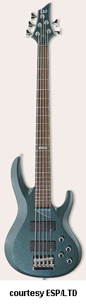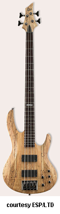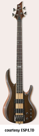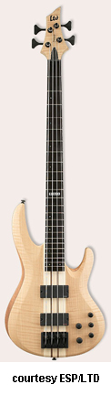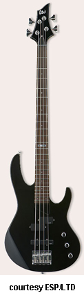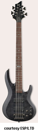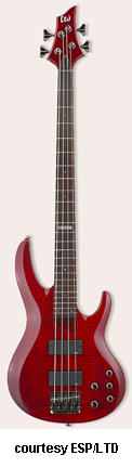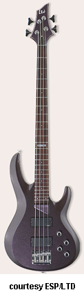 B-104 (SECOND VERSION) | - offset double cutaway basswood body, bolt-on maple neck, 24-fret rosewood fingerboard with dots and 12th fret model name inlays, bound matching finish headstock, two-per-side tuners, DB-4 bridge, two ESP SB-4 active pickups, four knobs (MV, b, t, balance), chrome hardware, available in Metallic Purple finish, 34 in. scale, new 2008. |